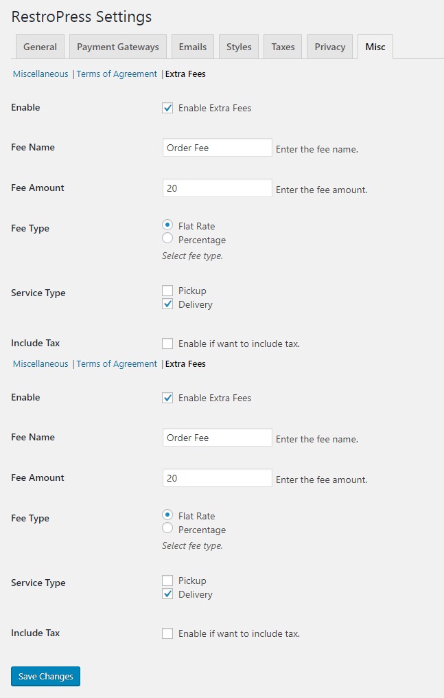 RestroPress Extra Fees extension allows you to charge an additional fee for your customer. The additional charge can be set in terms of flat fees or percentages. The extra fees can be applied based on specific service types, whether it is pickup or delivery. This extension works with all payment gateways. Extra fees will be available on the checkout page of the purchase.